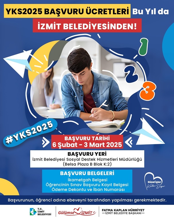 İzmit Belediyesi eğitimde fırsat eşitliği sağlamak ve ihtiyaç sahibi ailelerin eğitim giderlerine destek olmak amacıyla çalışmalarına devam ediyor. Sosyal Destek Hizmetleri Müdürlüğü, YKS’ye girecek olan ve Sosyal Destek Hizmetleri Müdürlüğünün sosyal yardımlarından düzenli şekilde faydalanan ihtiyaç sahibi öğrencilerin sınav giriş ücretlerini bu yıl da karşılayacak. Başvurular, 6 Şubat - 3 Mart 2025 tarihleri arasında Belsa Plaza B Blok’taki Sosyal Destek Hizmetleri Müdürlüğünde yüz yüze yapılacak.