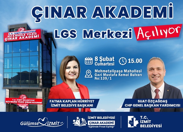 Eğitimde fırsat eşitliği sağlamak ve LGS’ye hazırlanan öğrencileri desteklemek amacıyla İzmit Belediyesi tarafından hayata geçirilen Ali& Nazile Yıldız Çınar Akademi LGS Merkezi, 8 Şubat Cumartesi günü (Yarın) saat 15.00’te kapılarını açıyor. Açılışa Cumhuriyet Halk Partisi (CHP) Eğitim Politikalarından Sorumlu Genel Başkan Yardımcısı Suat Özçağdaş da katılacak.
