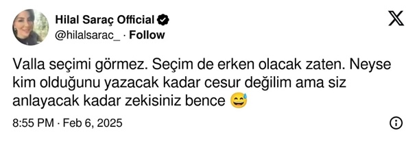 Hilal Saraç daha önce de erken seçimlere ilişkin yaptığı paylaşımla gündeme gelmişti.