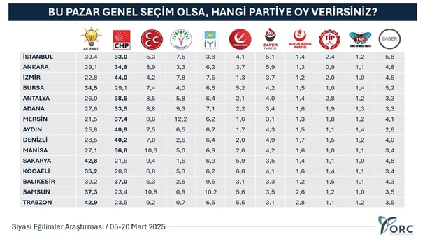 Belediye başkanı gözaltına alınıp tutuklanan ve görevden alınan İstanbul'da CHP diyenlerin oranı yüzde 33, AKP yüzde 30.4 oy aldı. İstanbul'da üçüncü sırada ise yüzde 7.5 ile DEM Parti yer aldı.