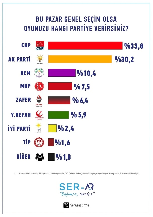 Ser Araştırma'nın 24-27 Mart tarihleri arasında 26 ilde 2 bin kişiyle CATI (Bilgisayar Destekli Telefonda Anket) yöntemiyle yaptığı çalışmada; CHP'nin yüzde 33,8 ile birinci parti olduğu görüldü.