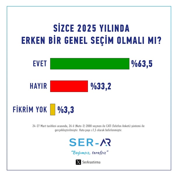 Ser Araştırma, 24-27 Mart tarihleri arasında, 26 ilde 2 bin seçmen ile CATİ (Bilgisayar Destekli Telefonda Anket) yöntemiyle yaptığı, güven aralığı yüzde 95, hata payı ± yüzde 1,5 olarak belirlenen anketinin sonuçlarını kamuoyu ile paylaştı.