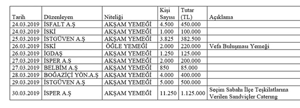 İBB Başkanı Ekrem İmamoğlu’nun tutuklanmasının ardından, geçmiş dönemde yapılan usulsüzlükler de su yüzüne çıkıyor. 2019’daki yerel seçimlerde; AKP’nin İBB Başkan Adayı Binali Yıldırım için milyonlarca TL’lik yemek organizasyonu yapıldığı ortaya çıktı. İBB müfettişlerinin hazırladığı yolsuzluk dosyasında 2019 seçimlerinde Binali Yıldırım için İBB’nin iştirak şirketlerinden bir haftada 35 bin kişiye, 3 milyon 587 bin 500 TL’lik (Yaklaşık 690 bin dolar. Bugünün kuruyla 26 milyon TL) harcama yapıldığı saptandı.