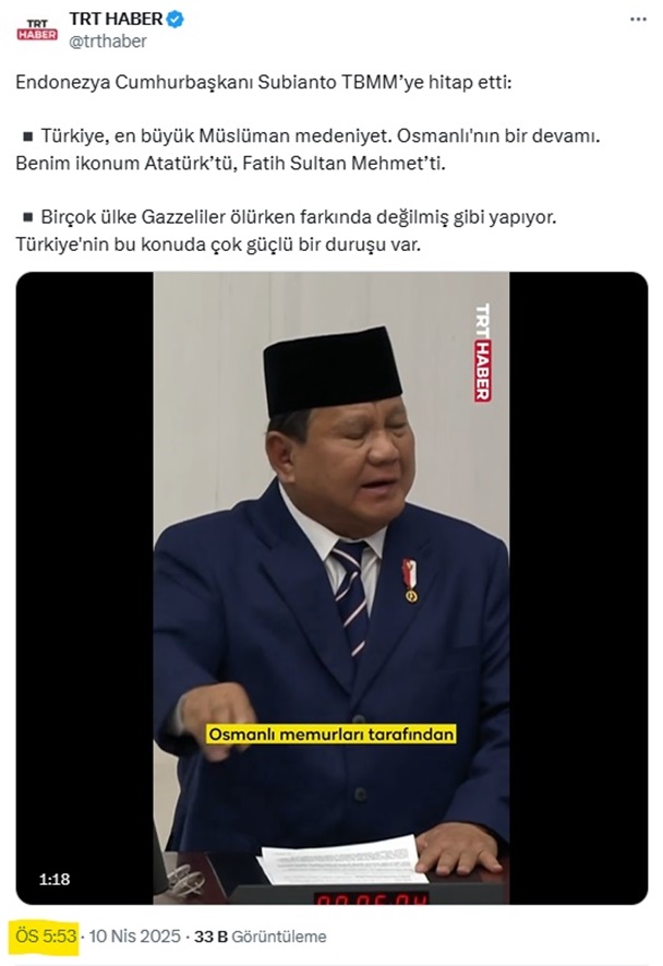 TRT Haber'in X'teki "Canlı" sayfasında Subianto'nun "Osmanlı" sözlerine yer verildi.
