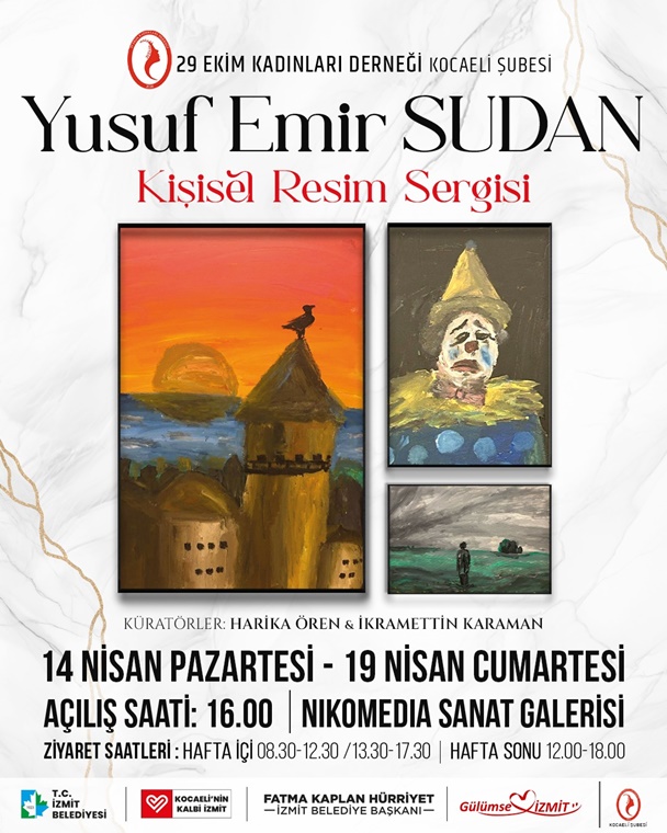 İzmit Belediyesi, genç yetenekleri desteklemeye devam ediyor. 29 Ekim Kadınları Derneği Kocaeli Şubesi Kültür Sanat Komisyonu’nun katkılarıyla düzenlenen Yusuf Emir Sudan Kişisel Resim Sergisi, 14 Nisan Pazartesi günü saat 16.00’da İzmit Belediyesi Nikomedia Sanat Galerisi’nde kapılarını açıyor.