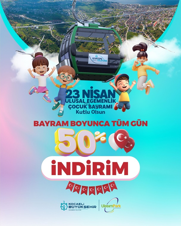 Kocaeli Büyükşehir Belediyesi, 23 Nisan Ulusal Egemenlik ve Çocuk Bayramı’nı çocuklara özel bir uygulama ile kutluyor. Bayram boyunca Kartepe Teleferik hattında tüm gün geçerli olmak üzere yüzde 50 indirim uygulanacak.