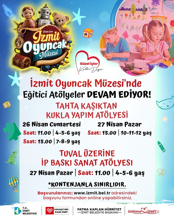 İzmit Belediyesi Oyuncak Müzesi, masalsı atmosferinde çocuklara yönelik yaratıcı atölye etkinliklerine ev sahipliği yapmaya devam ediyor. Oyuncak Müzesi’nde 26 Nisan Cumartesi saat 11.00’de 4-5-6 yaş grubu, saat 15.00’te ise 7-8-9 yaş grubu çocuklara yönelik “Tahta Kaşıktan Kukla Yapım Atölyesi” gerçekleştirilecek. 27 Nisan Pazar Günü saat 11.00’de 4-5-6 yaş grubu ile “Tuval Üzerine İp Baskı Atölyesi” saat 15.00’te ise 9-10-11 yaş grubuyla “Tahta Kaşıktan Kukla Yapım Atölyesi” yapılacak.