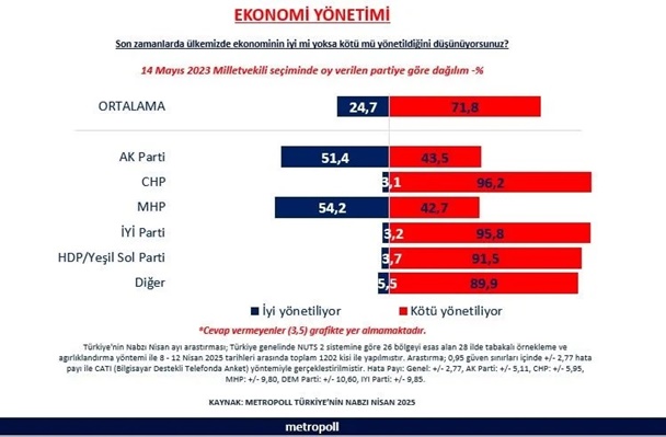 Diğer partilere oy veren seçmenlerin de yüzde 89,9'u ekonomi yönetimini kötü bulduğunu söyledi.
