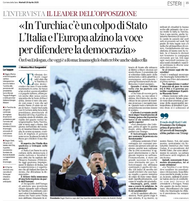 CHP Genel Başkanı Özgür Özel, bugün Roma'da düzenlenecek olan, Cumhurbaşkanı ve AKP Genel Başkanı Recep Tayyip Erdoğan'ın da iştirak edeceği İtalya-Türkiye dördüncü hükümetlerarası zirve öncesinde, İtalyan Corriere Della Sera adlı gazeteye konuştu.