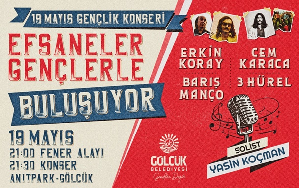 19 Mayıs Pazartesi günü saat 21.00’da Gölcük Kongre Sarayı’ndan başlayacak Fener alayının Anıtpark’a ulaşması sonrasında, bayram coşkusunu yaşayan gençleri, Gençlik Konseri karşılayacak. 21.30’da düzenlenecek konserde; Erkin Koray, Cem Karacak, Barış Manço ve 3 Hürel’in unutulmaz eserleri solist Yasin Koçman tarafından seslendirilecek. Unutulmaz şarkılara eşlik edecek gençler, bayram coşkusunu doyasıya yaşayacak.