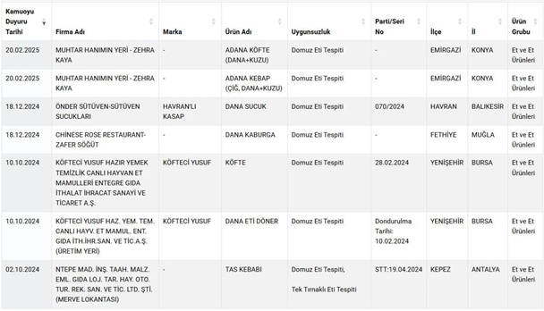 Öte yandan 20 Şubat 2025 tarihinde de Muhtar Hanım'ın yeri adlı işletmede Adana köfte ve Adana kebabın içinden domuz eti çıktı.