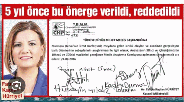 İzmit Belediye Başkanı Fatma Kaplan Hürriyet, sosyal medya hesabından yaptığı açıklamada; “Yıl: 2015, Müsilajla ilgili defalarca önergeler verdik. Deniz yüzeyindeki kızarmalar ve renk değişiklikleri ileride oluşacak Müsilajın habercisi olabilir. Önlem almak lazım dedik. Dönemin Genel Sekreteri Tahir Büyükakın cevap verdi; “Sağlığa zararlı değil, basit bir doğa olayı ve algı patlamasıdır bu. İnsanları denizden soğutmayın” dedi.