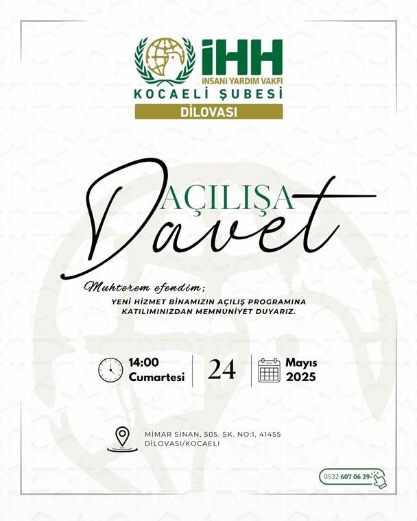 Açılış programına, yerel yöneticiler, STK temsilcileri, gönüllüler ve vatandaşların yoğun katılım göstermesi bekleniyor. Törende, İHH’nın misyonu ve gelecek dönemde Dilovası’nda gerçekleştirilmesi planlanan faaliyetlerle ilgili bilgilendirme de yapılacak.