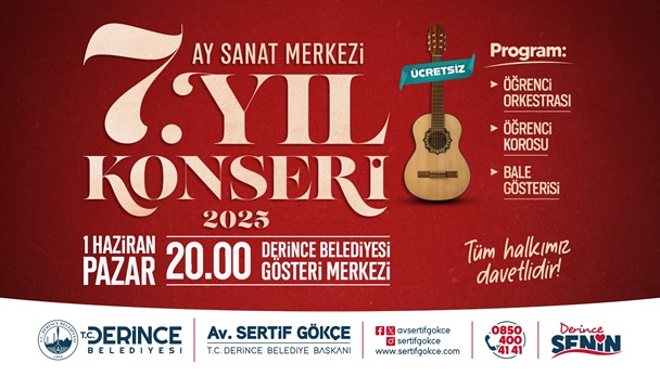 Derince Belediyesi, kültürel ve sanatsal etkinlikler kapsamında hafta sonu bir etkinliği daha ilçe halkı ile buluşturuyor. Derince Belediyesi’nin Ay Sanat Merkezi ile birlikte düzenleyeceği "7. Yıl Konseri” adlı etkinlik 1 Haziran Pazar günü saat 20.00’de Derincelilerle buluşacak.