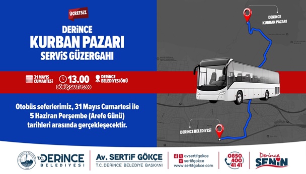 Bu tarihler arasında saat 13.00’te Derince Belediyesi önünden kalkacak olan araç vatandaşları Kurban Pazarı’na götürecek. İlçe sakinleri burada alışverişlerini yaptıktan sonra saat 15.00’te Kurban Pazarı’ndan hareket edecek araçla Derince’ye geri dönecek.