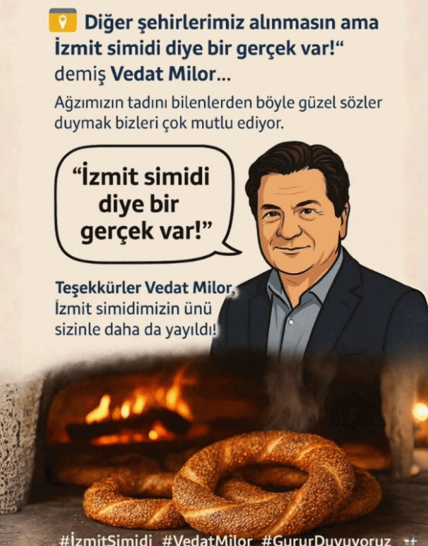 İzmit Belediye Başkanı Fatma Kaplan Hürriyet, gastronomi yazarı Vedat Milor’un, "Diğer şehirlerimiz alınmasın ama ülkemizde odun fırınında pişmiş İzmit simiti diye bir gerçek var" paylaşımına kayıtsız kalmadı. Başkan Hürriyet sosyal medya hesabı üzerinden yaptığı açıklamada, Milor’un İzmit simidiyle ilgili övgü dolu sözlerine teşekkür ederek kendisini “Çay, Simit, İzmit” programına konuk olmaya çağırdı.