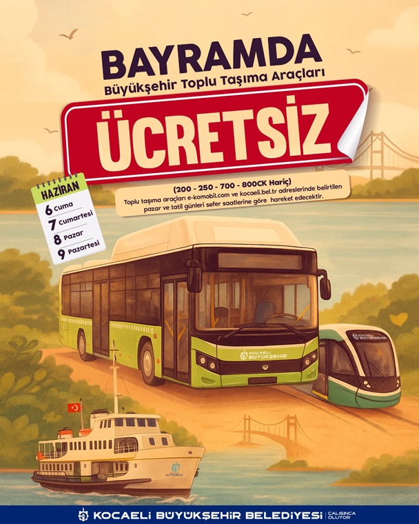 Kocaeli Büyükşehir Belediyesi, Kurban Bayramı’nda vatandaşların rahat ve huzurlu bir şekilde ziyaretlerini gerçekleştirebilmeleri amacıyla 06-09 Haziran tarihleri arasında kent içi toplu taşıma araçlarının ücretsiz olacağını duyurdu. Bu kapsamda vatandaşlar, Kurban Bayramı’nın birinci günü olan 06 Haziran Cuma günü ile bayramın son gününe denk gelen 09 Haziran Pazartesi günü 24.00’e kadar 4 gün boyunca ücretsiz ulaşımdan yararlanabilecek.