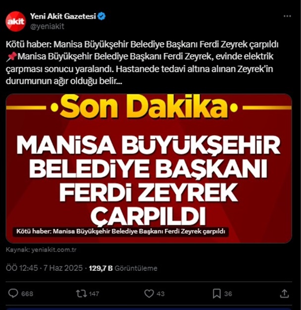 Manisa Büyükşehir Belediye Başkanı Ferdi Zeyrek, elektrik çarpması nedeniyle Manisa Celal Bayar Üniversitesi Hafsa Sultan Hastanesi'nde tedavi altına alındı. 70 dakika kalp mesajıyla hayata tutunan Zeyrek için ödüllü Yeni Akit gazetesi “çarpıldı” başlığıyla haberi vermesi, sosyal medyada yoğun tepki çekti.