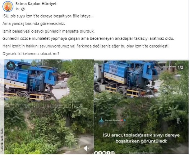 İzmit Belediye Başkanı Fatma Kaplan Hürriyet, İSU’nun pis suyu İzmit’teki dereye boşalttığı anları gösteren videoyu paylaştı. Hürriyet ardından da sosyal medya hesabından paylaşımda bulunarak, yaptığı paylaşımda şu ifadeleri kullandı;