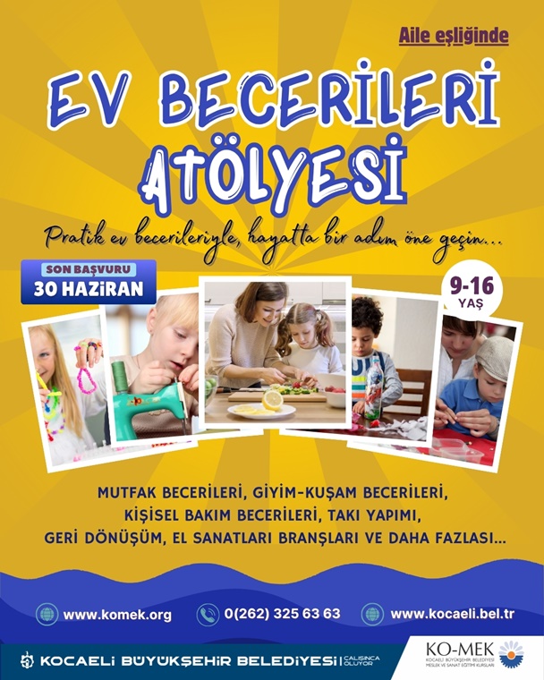 Kocaeli Büyükşehir Belediyesi Meslek ve Sanat Eğitimi Kursları (KO-MEK), yepyeni bir projeyle 9-16 yaş arası gençlere günlük yaşam becerileri kazandırmayı hedefliyor. “Ev Becerileri Atölyesi” 30 Haziran Pazartesi günü başlayacak.