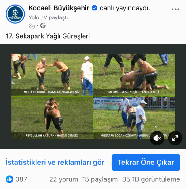 Kocaeli’nde bu yıl 17’ncisi düzenlenen Sekapark Altın Kemer Yağlı Güreşleri, sadece er meydanında değil, dijital mecralarda da büyük ilgiyle takip edildi. İki gün süren etkinlik boyunca, sosyal medya platformlarında yapılan canlı yayınlar ve paylaşımlar sayesinde milyonlarca kişiye ulaşıldı.
