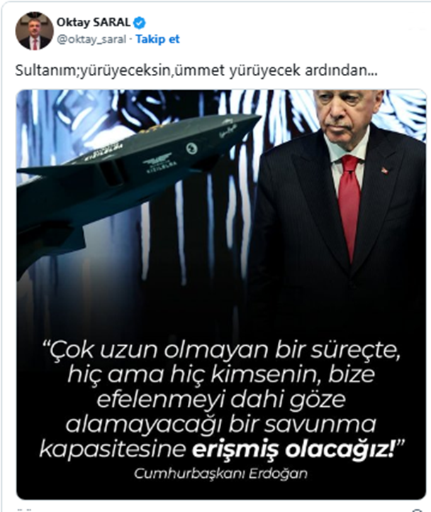 AKP’li Cumhurbaşkanı Recep Tayyip Erdoğan’ın danışmanı Oktay Saral, sosyal medya paylaşımıyla yeniden gündeme geldi. Erdoğan’a duyduğu sevgiyi ifade eden Saral, yaptığı paylaşımda, “Sultanım; yürüyeceksin, ümmet yürüyecek ardından…” ifadelerine yer verdi.
