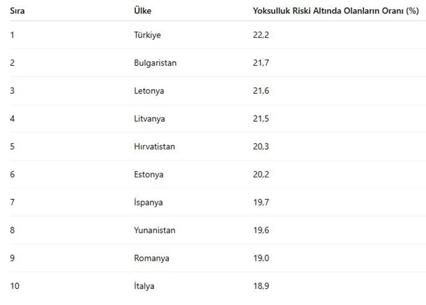 Ülkelere göre yoksulluk riski altında olan nüfus oranları incelendiğinde, Eurostat’ın açıkladığı AB’ye üye ve gözlem kapsamındaki toplam 29 ülke arasında en az yoksul nüfusa sahip ülkeler; yüzde 9,5 ile Çekya, 11,5 ile Belçika, 11,6 ile de Danimarka oldu. En fazla risk altında olanlar ise yüzde 22,6 ile Türkiye, yüzde 21,7 ile Bulgaristan, yüzde 21,6 ile de Letonya oldu.