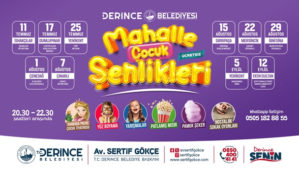 Çocuklara ve gençlere yönelik çalışmalara büyük önem veren Derince Belediye Başkanı Av. Sertif Gökçe, onların sosyal, kültürel ve sportif alanlarda gelişimlerini destekleyecek projelere imza atmaya devam ediyor. Bu kapsamda Derince Belediyesi tarafından geleneksel hale getirilen Mahalle Çocuk Şenlikleri’nin ikincisi bu yıl da birbirinden renkli etkinliklerle çocuklara unutulmaz bir yaz yaşatacak. 10 ayrı noktada ücretsiz olarak düzenlenen organizasyon ilk olarak 11 Temmuz Cuma günü saat 20.30’da İshakçılar Köy Meydanı’nda gerçekleşecek.
