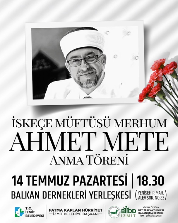 Batı Trakya Türkleri camiasının önemli isimlerinden, merhum İskeçe Müftüsü Ahmet Mete, vefatının 3. sene-i devriyesinde İzmit’te düzenlenecek özel bir programla anılacak. İzmit Belediyesi ve Batı Trakya Türkleri Dayanışma Derneği İzmit Şubesi’nin iş birliğiyle gerçekleştirilecek anma programı, bu akşam saat 18.30’da Balkan Dernekleri Yerleşkesi’nde yapılacak.