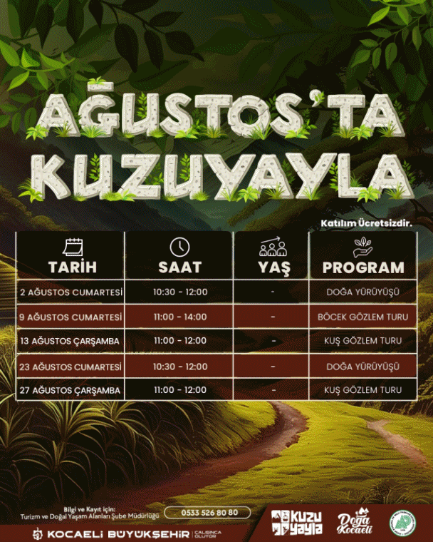 Tüm etkinlikler ücretsiz olarak düzenlenirken, yaş gruplarına göre planlanan programlarla her yaştan katılımcı doğada keyifli vakit geçirme şansı buluyor. 18 yaş üstü bireyler için cumartesi sabah koşuları, çocuklar için özel tasarlanmış orman okulu eğitimleri gibi farklı etkinlikler takvimde yer alıyor. Detaylı bilgi almak isteyenler, Ormanya için 0262 331 66 11, Kuzuyayla için ise 0533 526 80 80 numaralı telefonu arayabilir.