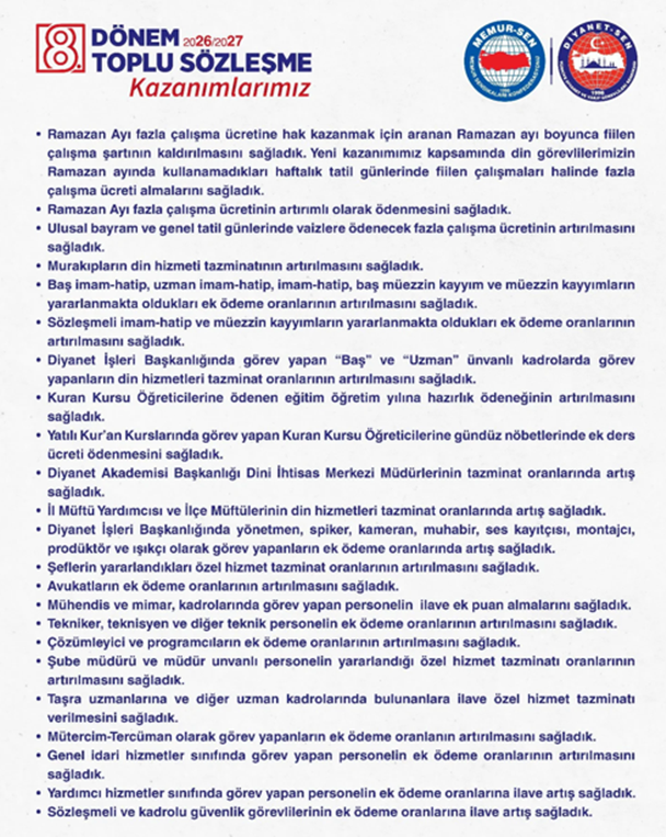 Sendika açıklamasında, "8. Dönem Toplu Sözleşme görüşmelerinde Diyanet ve Vakıf hizmet koluna ilişkin yeni kazanımlara imza atarken 7. Dönem kazanımlarımızı da koruduk" ifadelerine yer verdi.
