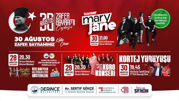 Derince Belediyesi, kortej yürüyüşünün ardından bu kez çok özel bir konser programı düzenleyecek. Ücretsiz olarak gerçekleşecek ve tüm ilçe sakinlerinin davetli olduğu konser 30 Ağustos Cumartesi günü saat 21.00’de Derince Belediyesi Gösteri Merkezi’nde başlayacak. Her yaştan katılımcının büyük ilgi göstereceği konserde sahne alacak olan Mary Jane grubu, Zafer Bayramı’nın son gününde Derincelilere unutulmaz bir akşam yaşatacak.