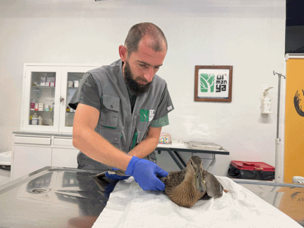 Yaralı ve yardıma muhtaç yaban hayvanları için güvenli bir sığınak olan Ormanya Yaşam Merkezi’ne teslim edilen ördeğe veteriner hekimler tarafından ilk muayenesi yapıldı. Kontrollerde, ördeğin beslenme eksikliği ve düşük sıcaklık nedeniyle ileri derecede dehidrasyon yaşadığı tespit edildi. Herhangi bir kırık ya da doku zedelenmesine rastlanmayan ördeğe sıvı ve besin takviyesi sağlandı.