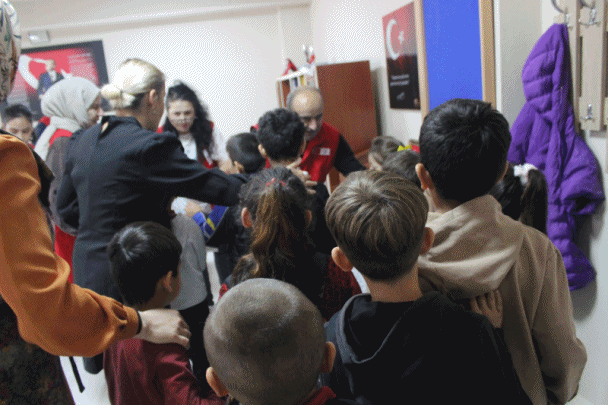 Yardımlar, Okul Müdiresi Ayşe Emel Yıldırım ve öğretmenler eşliğinde öğrencilere teslim edildi. Dağıtım sırasında öğrencilerin mutluluğu gözlerinden okunuyordu. Yeni mont ve botlarını alan minikler, sevincini Kızılay ekibine sarılarak gösterdi. Ayrıca öğrencilere Kızılay’a ait çeşitli bilgilendirici dökümanlar da dağıtıldı.