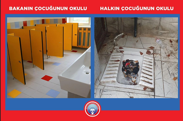 Eğitim-İş Başkanı Kadem Özbay, Milli Eğitim Bakanı Yusuf Tekin’in kızının okuduğu okulun görüntüleri ile yıkık dökük bir devlet okulunun görüntülerini paylaştı. Öğretmenler ile birlikte Milli Eğitim Bakanlığı önünde MEB bütçesini protesto eden Eğitim-İş Başkanı Kadem Özbay, Milli Eğitim Bakanı Yusuf Tekin’in çocuğunun gittiği okulun lüks koşulları olduğunu, devlet okullarının ise bakımsızlıktan kurtulamadığını söyledi. Özbay SÖZCÜ’ye yaptığı açıklamada şöyle dedi:
