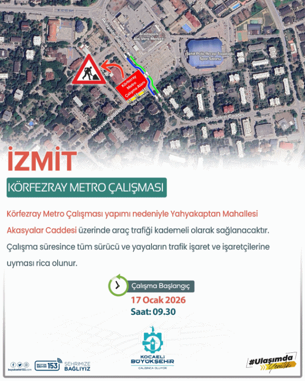 Körfezray Metro Projesi kapsamında yürütülecek altyapı çalışmaları nedeniyle Yahyakaptan Mahallesi Akasyalar Caddesi ve D-100 Yanyol trafiğe geçici olarak kapatılacak. Altyapı çalışmalarının güvenli ve planlı şekilde yürütülmesi amacıyla etaplar halinde uygulanacak düzenlemelerin proje takvimine uygun olarak tamamlanmasının ardından yollar yeniden trafiğe açılacak.