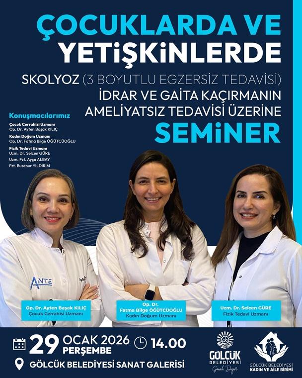 Gölcük Belediyesi Kadın ve Aile Birimi koordinasyonunda düzenlenecek seminer, 29 Ocak Perşembe günü saat 14.00’te Gölcük Belediyesi Sanat Galerisi’nde gerçekleştirilecek. Seminerde; Çocuk Cerrahisi Uzmanı Op. Dr. Ayten Başak Kılıç, Kadın Doğum Uzmanı Op. Dr. Fatma Bilge Öğütcüoğlu, Fizik Tedavi Uzmanı Uzm. Dr. Selcen Güre ve Fizyoterapistler Ayça Albay ve Busenur Yıldırım; skolyoz, idrar ve gaita kaçırma sorunlarına yönelik önemli bilgiler paylaşacaklar.