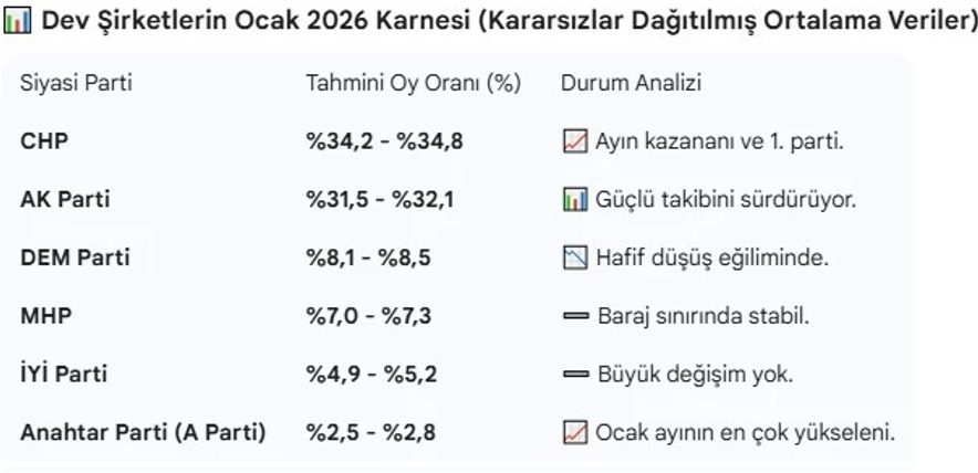 Ocak 2026'nın son haftası itibarıyla Türkiye’nin önde gelen araştırma şirketleri PİAR, SONAR, ORC ve ASAL Araştırma tarafından paylaşılan veriler, siyasetin nabzını tutmaya devam ediyor. Ocak ayı anket sonuçlarının ortalamasına göre ayın kazananı Cumhuriyet Halk Partisi (CHP) oldu.