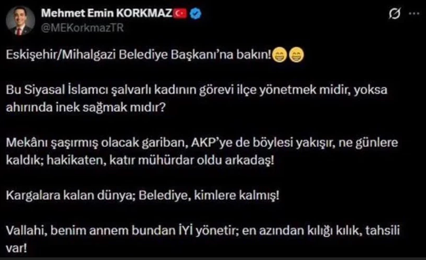 Bir kadını kılık kıyafeti, inancı ve yaşam tarzı üzerinden hedef alan; onurunu ve kişiliğini aşağılamaya yönelik bu çirkin ve ayrımcı ifadeler asla kabul edilemez. Seçilmiş bir kamu görevlisine ve milli iradeye yönelen bu nefret dili, hukuk ve vicdan önünde mutlaka karşılığını bulacaktır.