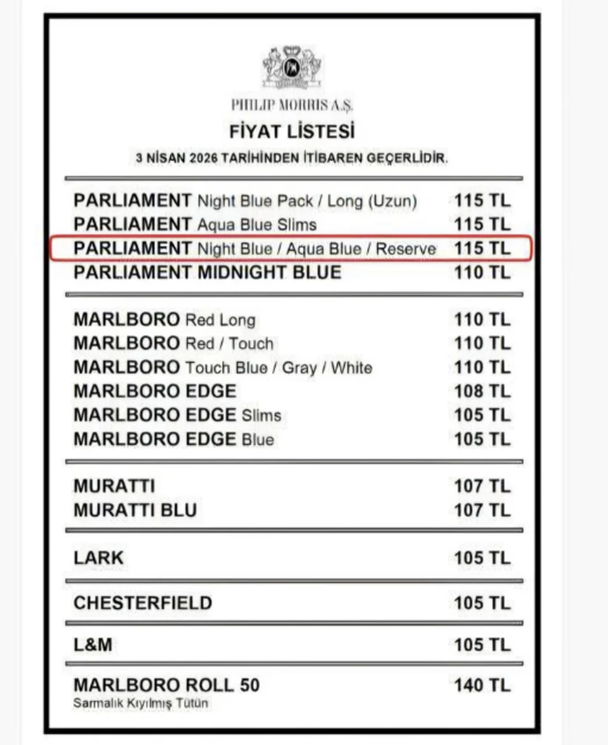 Sigara fiyatlarına yeni bir artış daha geldi. Son düzenlemeyle zam yalnızca belirli bir markayı kapsadığı belirtildi. Tekel Bayileri Platform Başkanı Özgür Aybaş, Philip Morris grubundaki Parliament Night Blue, Aqua Blue ve Reserve grubunun fiyatına 5 TL eklendi.