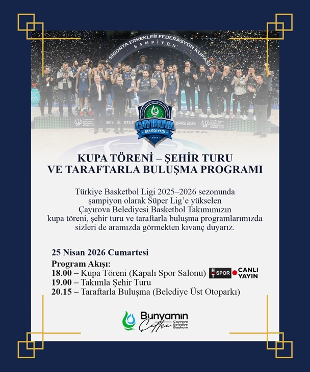 Bundan 5 yıl önce Çayırova Belediye Başkanı Bünyamin Çiftçi’nin öncülüğünde kurulan ve 5 yılda aldığı 5 kupayla birlikte süper lige yükselme başarısı gösteren Çayırova Belediyesi Basketbol Takımı, Türkiye Basketbol Ligi 2025-2026 Sezonu’nun şampiyonluk kupasına kavuşuyor. 25 Nisan Cumartesi günü (Yarın) gerçekleştirilecek törenle kupayı kaldıracak olan Çayırova Belediyesi Basketbol Takımı, daha sonrasında ise taraftarıyla bütünleşecek ve şehirde şampiyonluk turu gerçekleştirecek.