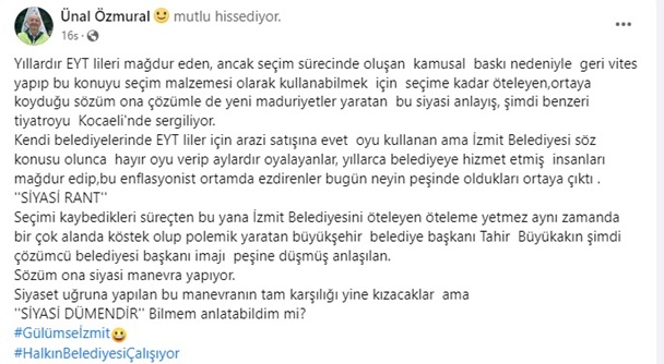 Yapılan çalışmayla ilgili açıklamalarda bulunan Akmeşe Cumhuriyet Mahallesi Muhtarı Rahim Varol, “Bu bölge heyelan bölgesi olduğu için yolda büyük çatlaklar ve yarılmalar oluştu. İzmit Belediyemize ilettiğimiz talep sonucunda köklü bir çözüme imza atıldı” dedi.