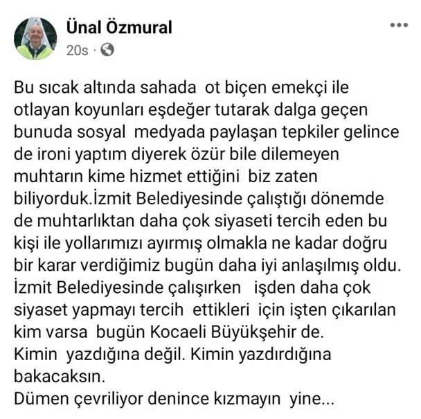 “Biliyorsunuz 1 sene boyunca mücadele ettik ve kendi araçlarımızın bir kısmını aldık. Bunun 2 nedeni vardı. Çalışanlarımızın daha iyi koşullarda alışması. Ve tasarruf etmekti. İşte tasarrufların sonucu. Araç aldık tasarruf ettik. Ve bu tasarrufumuzu yandaşa, betona değil işçimize, emekçimizin alın terine verdik. Biz işçimize lütfetmedik. Biz işçimize hakkını verdik. İmzalanan toplu iş sözleşmesi tüm çalışanlarımıza tüm emekçilerimize hayırlı uğurlu olsun” diyerek sözlerini sonlandırdı.