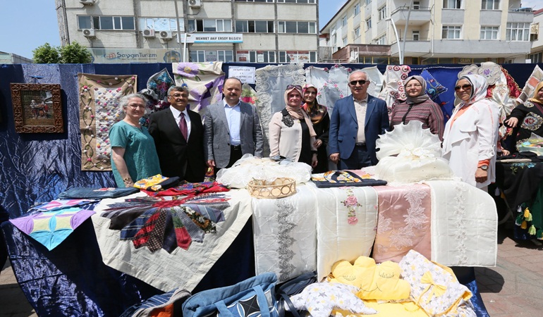 Saygı duruşu ve İstiklal Marşı’nın okunmasıyla başlayan programda İlçe Halk Eğitim Merkezi Müdürü Abdulkadir Yardımcı bir konuşma yaptı. Derince Belediyesi Mesleki Eğitim Kursları (DER-MEK) ile birlikte yıl içerisinde birbirinden önemli kurslara imza attıklarını belirten Yardımcı, “Bu eğitim döneminde 650 kursumuzda 11 bine yakın kursiyerimiz eğitim gördü. 7’den 70’e her kesime hitap eden kurslarımıza, yeni dönemde de devam edeceğiz” dedi. Konuşmanın ardından Derince Kaymakamı Meftun Dallı ve Derince Belediye Başkanı Zeki Aygün’ün katılımlarıyla serginin açılış kurdelesi kesildi. Mehteran gösterisinin sahnelendiği sergi alanında Halk Eğitim Merkezi ve DER-MEK’te yıl içinde hazırlanan eserleri inceleyen Başkan Aygün, “Birbirinden güzel el emeği, göz nuru eserleri hazırlayan kursiyerlerimizi ve usta öğreticilerimizi tebrik ediyorum” dedi.