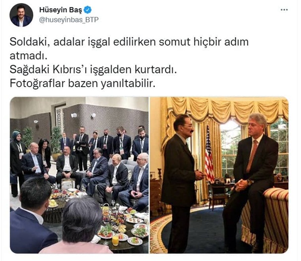 Erdoğan’ın bu fotoğrafı üzerinden sosyal medyada yapılan, ‘dünya lideri” propagandasına ve yine aynı çevrelerce Ecevit - Clinton görüşmesinin sıkça eleştirilmesine gönderme yapan BTP lideri, Ecevit döneminde Kıbrıs’ın işgalden kurtarıldığını, Erdoğan döneminde ise adaların işgal edildiğine dikkat çekerek “Fotoğraflar bazen yanıltabilir” dedi. BTP Genel Başkanı Hüseyin Baş’ın paylaşımı şu şekilde; “Soldaki, adalar işgal edilirken somut hiçbir adım atmadı. Sağdaki Kıbrıs’ı işgalden kurtardı. Fotoğraflar bazen yanıltabilir”