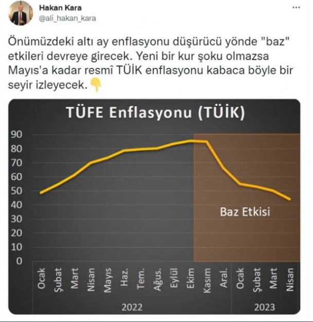 "Önümüzdeki altı ay enflasyonu düşürücü yönde "baz" etkileri devreye girecek. Yeni bir kur şoku olmazsa Mayıs'a kadar resmî TÜİK enflasyonu kabaca böyle bir seyir izleyecek.