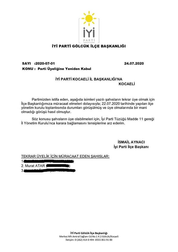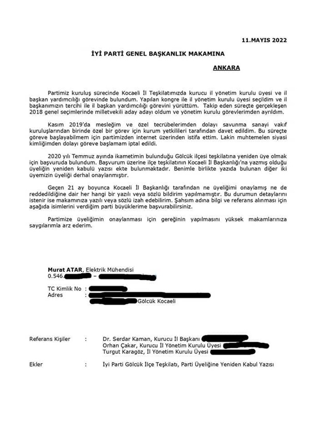 2020 yılı Temmuz ayında yeniden üye olmak üzere Gölcük İlçe Başkanlığı’na başvuruda bulundum. Ekte Gölcük İlçe Teşkilatı’nın üyeliğimin kabulü için il teşkilatına yazmış olduğu yazıyı görebilirsiniz. Bu yazıda benimle birlikte üyeliğinin onayı istenen iki üyemizin onayı il teşkilatı tarafından yapılmıştır. Ama benim üyeliğim “kendilerine muhalif olduğum gerekçesi” ile kabul edilmemiştir.