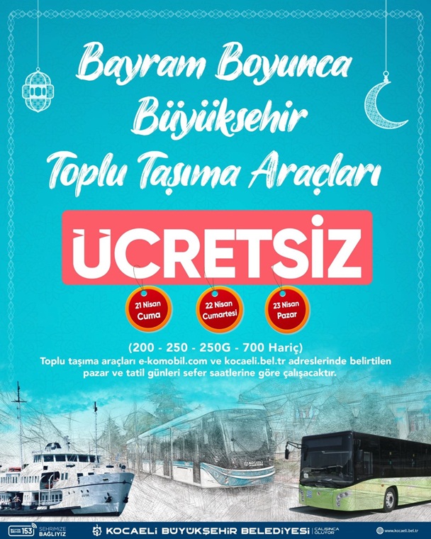 Ücretsiz ulaşım Ramazan Bayramı süresince deniz ulaşımı, belediye otobüsleri ve tramvay için geçerli olacak. Toplu taşıma araçları, Eko-mobil ve kocaeli.bel.tr adreslerinde belirtilen pazar tatil sefer saatlerine göre çalışacak.