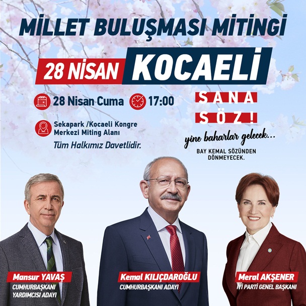 Millet İttifakı Cumhurbaşkanı adayı Kemal Kılıçdaroğlu ve İYİ Parti Genel Başkanı Meral Akşener’in katılımı ile 28 Nisan Cuma Günü saat 17.00’da Kocaeli Kongre Merkezi Miting ve Etkinlik Alanı’nda düzenlenecek Kocaeli Millet Buluşması Mitingi’ne, ittifak kurmaylarından Cumhurbaşkanı Başkan Yardımcısı adayı Ankara Büyükşehir Belediye Başkanı Mansur Yavaş’ın da katılacağı duyuruldu.