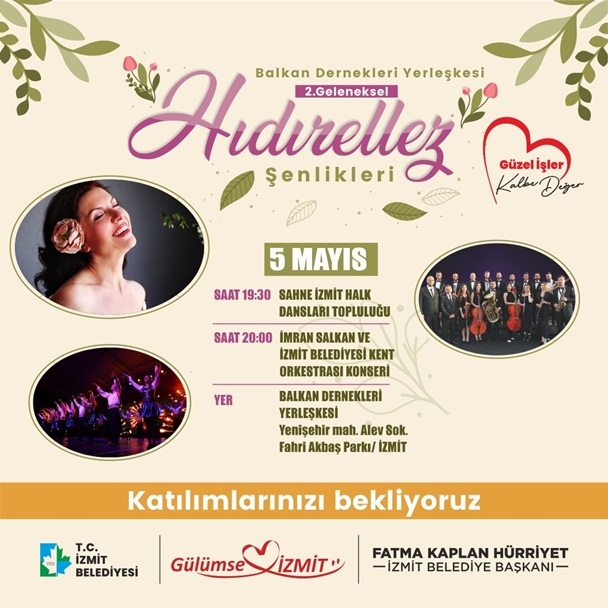 İzmit Belediyesi Kültür ve Sosyal İşler Müdürlüğü ile Balkan Dernekleri ortaklığıyla baharın müjdecisi ve doğanın uyanışının temsili olan “2. Geleneksel Hıdırellez Şenlikleri” bu yıl da büyük bir coşku ile kutlanacak. “2. Geleneksel Hıdırellez Şenlikleri”, 5 Mayıs Cuma günü saat 18.00’de Yenişehir Mahallesi Fahri Akbaş Parkı’nda İzmit Belediyesi Balkan Dernekleri Yerleşkesi’nde gerçekleşecek.